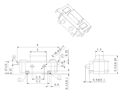|  | 型號(hào)規(guī)格:TST3635系列 | 中文命名:3*6*3.5定位貼片支架輕觸開(kāi)關(guān) |