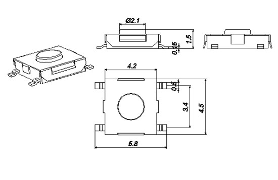 |  | 型號規(guī)格:TSTP4515系列 | 中文命名:4.5x4.5x1.5貼片型輕觸開關(guān) |